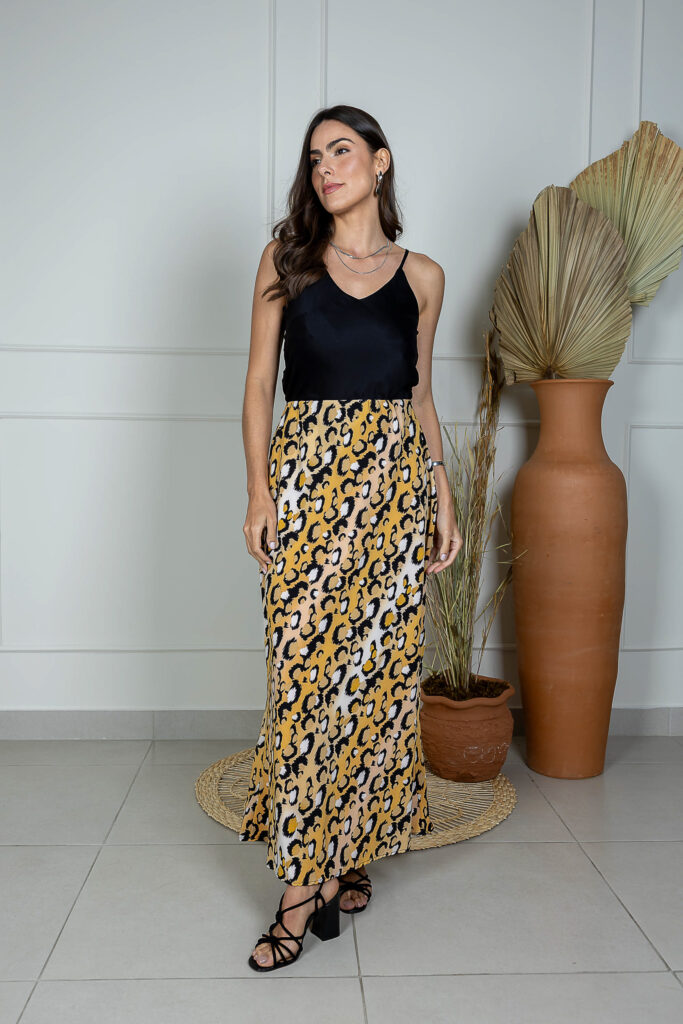 Saia Crepe Estampado Midi Fenda Lateral Elástico Costas