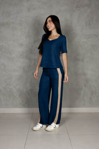 Calça Polilinho Detalhe Contraste Lateral Elástico Costas Bolso
