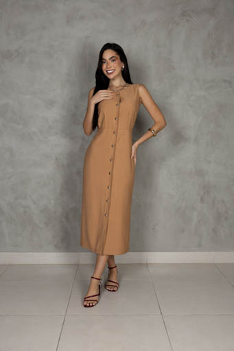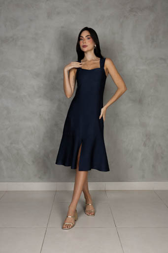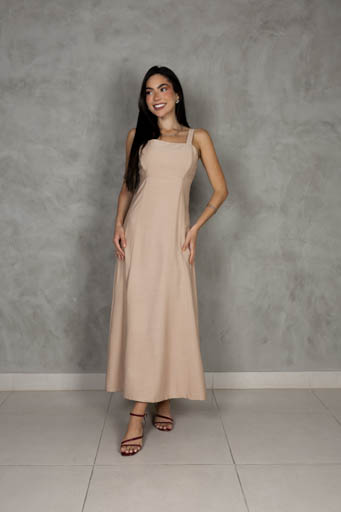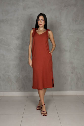 Vestido Midi Linho Alça Amarração Fenda Lateral