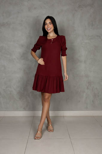 Vestido Curto Crepe Manga Bufante Babado Barra