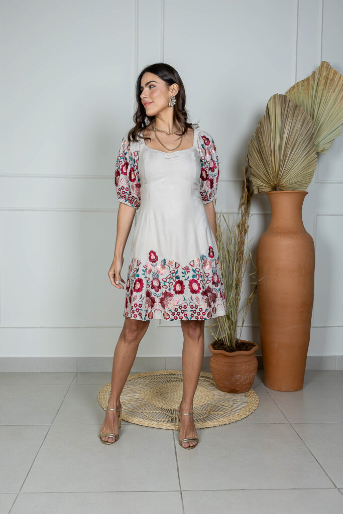 Vestido Viscose Bordada Curto Manga Bufante