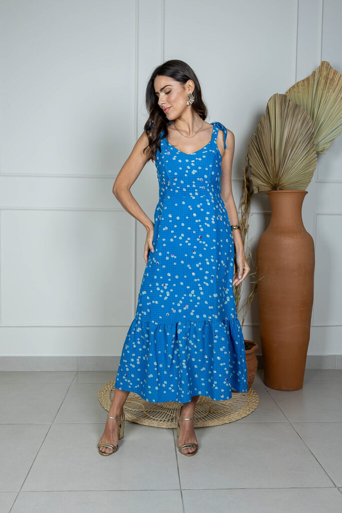Vestido Lasie Bordada Longo Alça Amarração Barrado Frazido