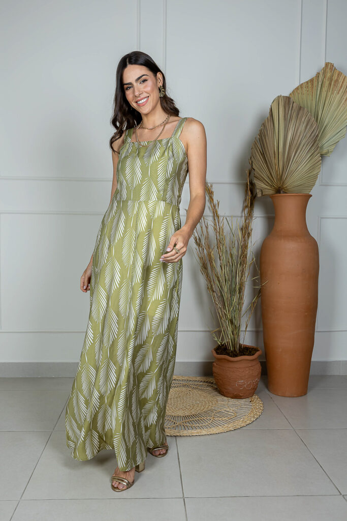 Vestido Crepe Estampado Longo Fenda Frente Alça Larga Lastex Costas